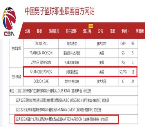 北京时间1月1日,CBA官方公布最新的外援注册情况,新疆取消外援理查德森注册,他本赛季场均仅有2.2分。四川注册第二位外援庞兹,组成双外援阵容。