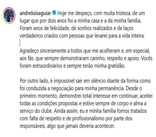 “然而,面对俱乐部管理层在续约谈判中的处理方式,我无法默然离去。从一开始,我就明确表达了强烈的留队意愿,接受了对方提出的所有条件,并始终全身心为俱乐部服务。尽管如此,我和我的家人却遭到了相关负责人的不尊重和不专业对待,这是绝不应该发生的。”路易斯表示。