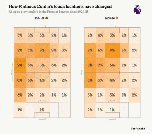 值得肯定的是,阿莫林和库尼亚在多场比赛中找到了新的方式,即便没有类似狼队时期拉森那样的中锋。在安菲尔德2-1的胜利证明了球队在无中锋体系下的可行性,库尼亚更多通过争抢长传后的第二落点,并在转换阶段参与进攻。曼联在比赛中偶尔会在对方禁区前出现一小段进攻空当,但库尼亚正在尝试绕开这一空间,而不是被限制其中。需要注意的是,本赛季多古和达洛特从库尼亚脚下接球时所处的位置靠前。曼联2025-26赛季的走势,在很大程度上将取决于翼卫在进攻三区的表现。