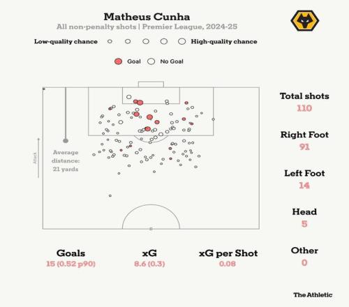 正如去年夏天所指出的那样,库尼亚是上赛季xG超额完成最明显的球员之一,这样的效率不太可能在老特拉福德持续。目前,库尼亚保持了2024-25赛季的射门频率,但进球运气有所下降。回顾他上赛季的射门分布,他既有远射,也有在点球区与六码区之间完成的机会。在加盟曼联的首个赛季进行到一半时,这些行为模式仍在出现,但成功率有所降低。