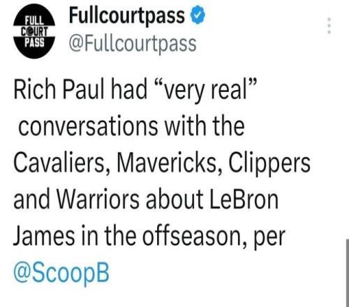 北京时间1月3日,虽然詹姆斯的经纪人里奇-保罗认为詹库联手根本不可能发生,但据美记布兰登-罗宾逊报道,里奇-保罗曾在休赛期与四支球队进行过试探性但极具实质意义的对话,讨论关于詹姆斯的交易。这四支球队分别是独行侠、勇士、快船和骑士。