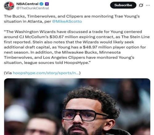 根据此前名记Stein报道,老鹰队正在积极兜售特雷杨,并且已经和奇才队围绕特雷杨与CJ互换的交易框架展开讨论。