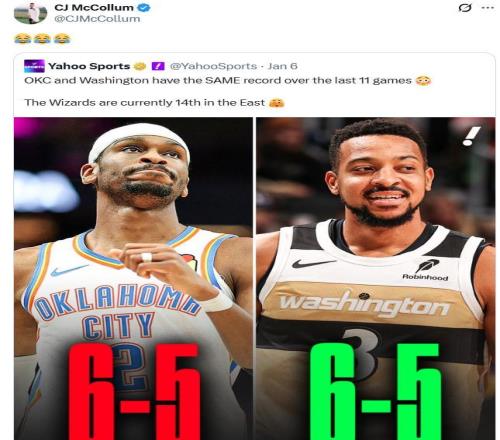值得一提的是,在本场爆冷击败魔术队之前,奇才队后场核心CJ就已经发现球队战绩追平联盟第一雷霆。