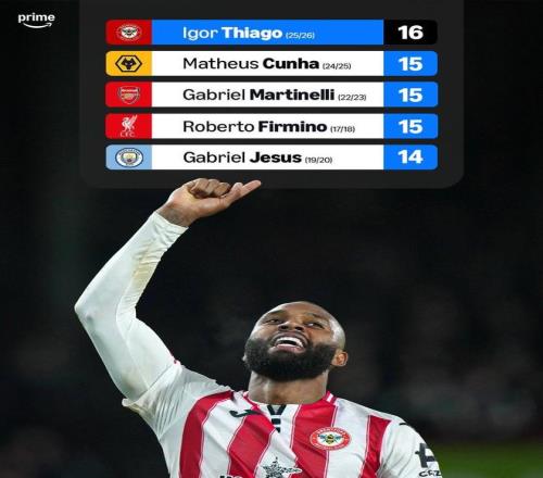 至此,伊戈尔-蒂亚戈本赛季代表布伦特福德在英超出场21次已打入16球。