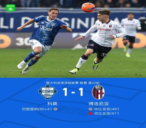 北京时间1月10日,意大利足球顶级联赛第20轮,科莫主场迎战博洛尼亚。比赛开始后,博洛尼亚率先打破僵局,圣地亚哥-卡斯特罗送出助攻,坎比亚吉完成破门。随后比赛局势发生转折,坎比亚吉因犯规被红牌罚下。人数占优的科莫持续施压,并在补时阶段由赫苏斯-罗德里格斯助攻巴图里纳扳平比分。最终双方以1比1握手言和。